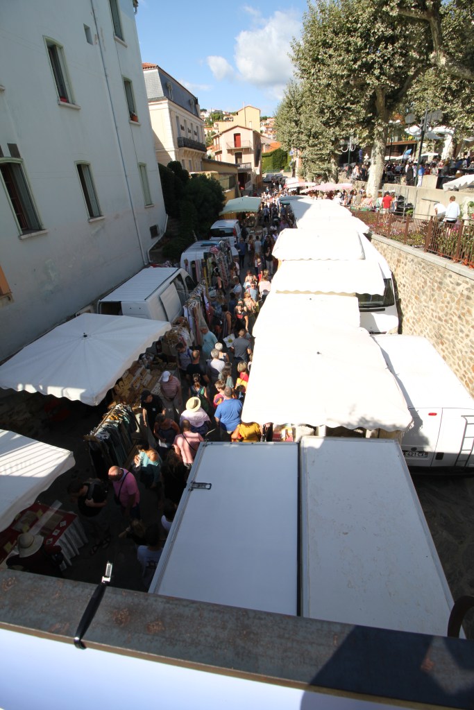 Maar met veel geduld raken we in Collioure. Hier staat op borden welke parkings er nog vrije plaatsen hebben Veel zijn het er niet. We nemen de eerste die we tegen komen. Na een kwartiertje stappen komen we aan in het centrum. Niet alleen is er dit weekend een soort “open lucht” boekenbeurs er vinden ook een aantal muziekoptredens plaats. Toevallig is het Zondag ook marktdag. Dit veroorzaakt zeker de drukte. De markt is niet alleen in de straatjes rond het centrum maar ook in de droge rivierbedding. Dezelfde rivierbedding waar we 24 jaar geleden na een wolkbreuk auto’s naar zee zien drijven hebben.